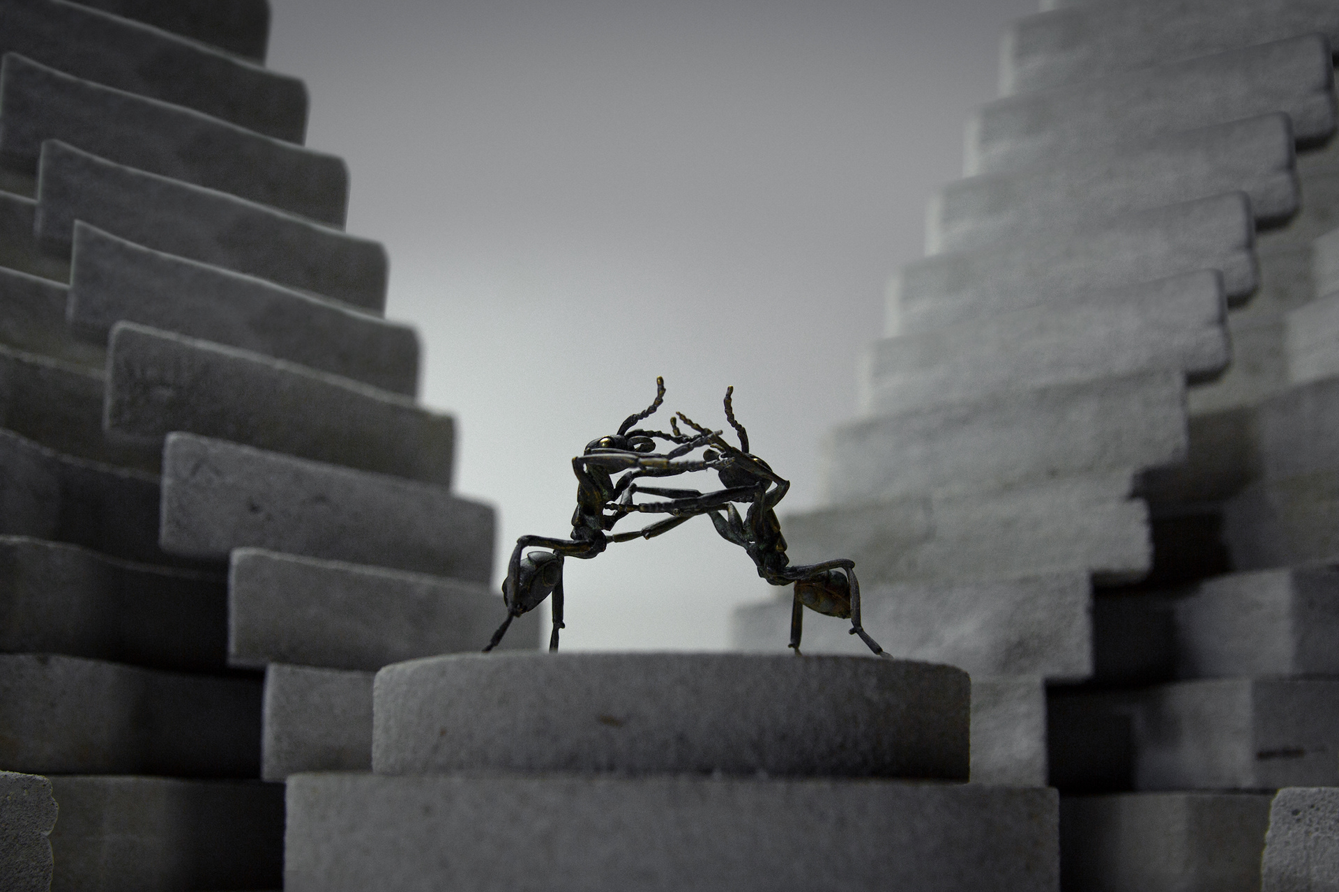 Las hormigas se comunican, el pensamiento no se detiene: las hormigas no duermen. Neural nació como una instalación de la cual derivó este ensayo fotográfico, danza entre el pensamiento neurótico y las preguntas existenciales, atemporales, imposibles de responder pero siempre vivas. Las luces y las sombras son las energías que constituyen el espacio en las que el hormiguero rígido soporta las derivas permanentes de hormigas resistentes y eléctricas como el bronce.